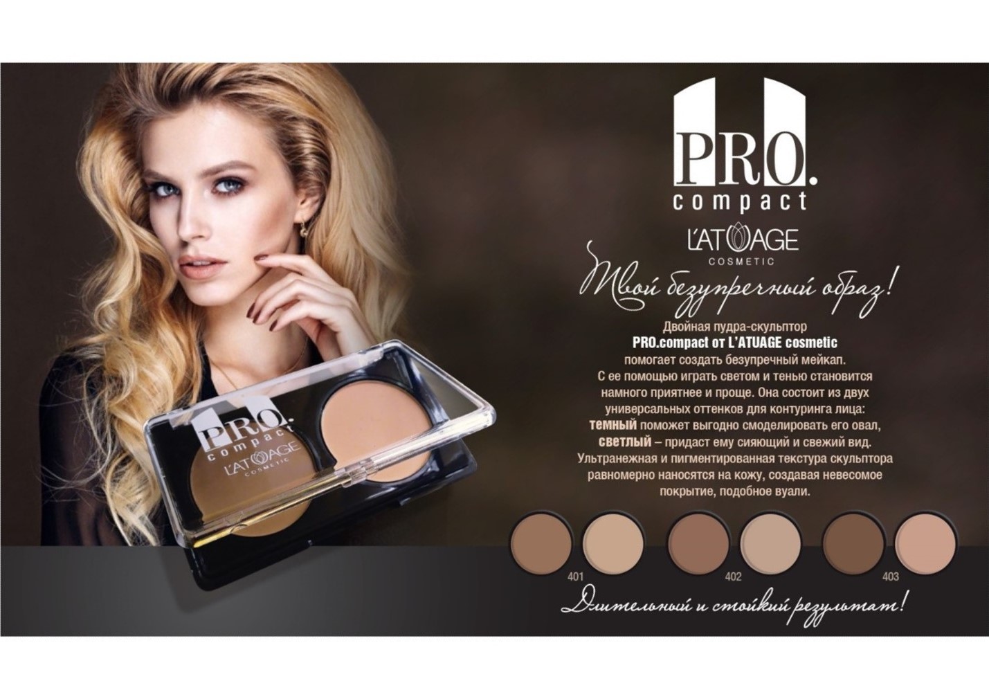 Двойная пудра-скульптор PRO.compact от L’ATUAGE cosmetic помогает создать безупречный мейкап. С ее помощью играть светом и тенью становится намного приятнее и проще. Она состоит из двух универсальных оттенков для контуринга лица.
